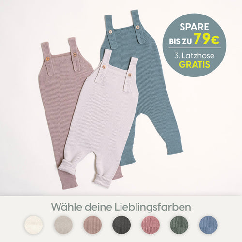 3 für 2 Aktion - Spare bis zu 79€ auf kuschelig-weiche, mitwachsende Latzhosen für maximale Bewegungsfreiheit.