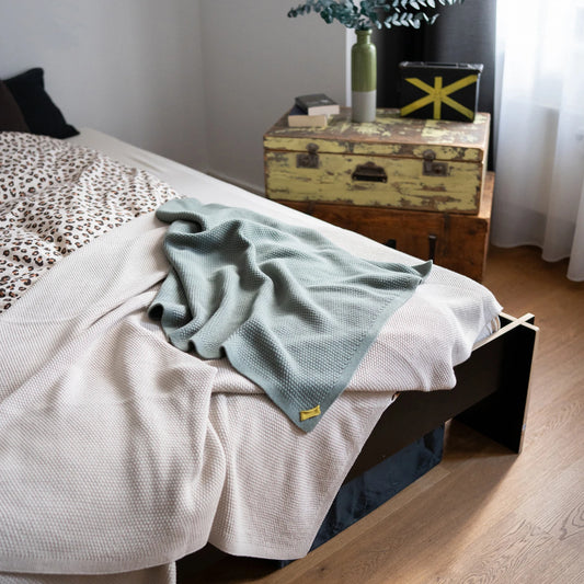Strickdecke aus GOTS Merinowolle in warmem Beige
