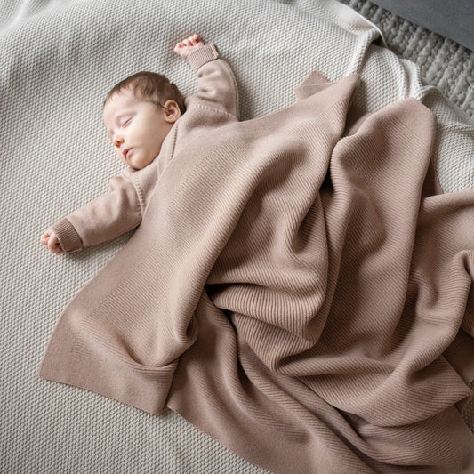 Strickdecke aus GOTS Merinowolle in einem warmen Beige-Braun