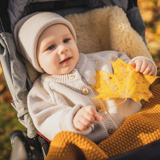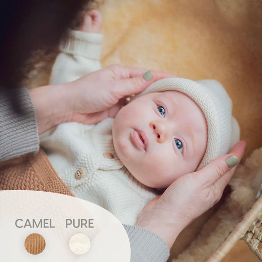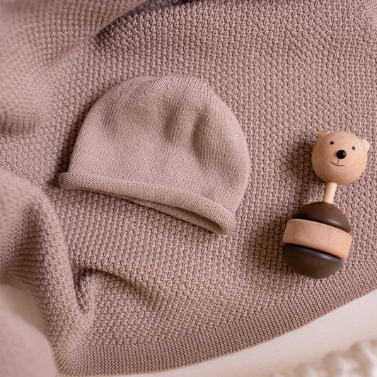 Baby-Strickmütze aus GOTS Merinowolle in warmem Beige
