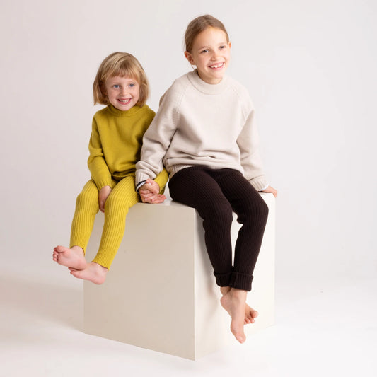 Mitwachsende, wärmeregulierende Strick-Leggings aus 100% GOTS Merinowolle.