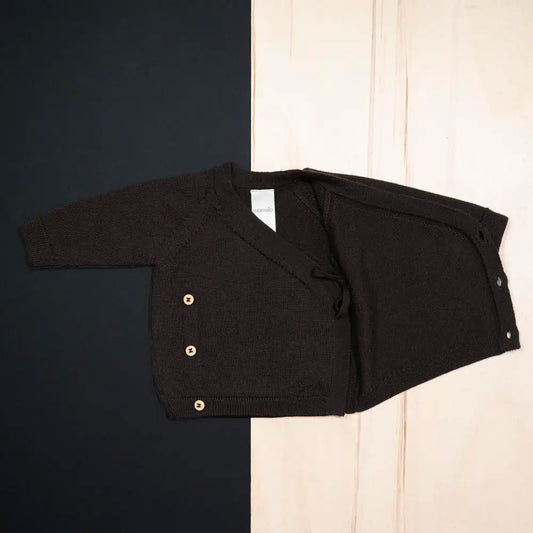 Mitwachsende Wickeljacke aus GOTS Merinowolle in einem dunklen, warmen Braun