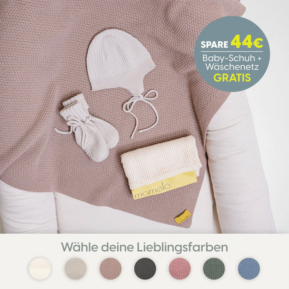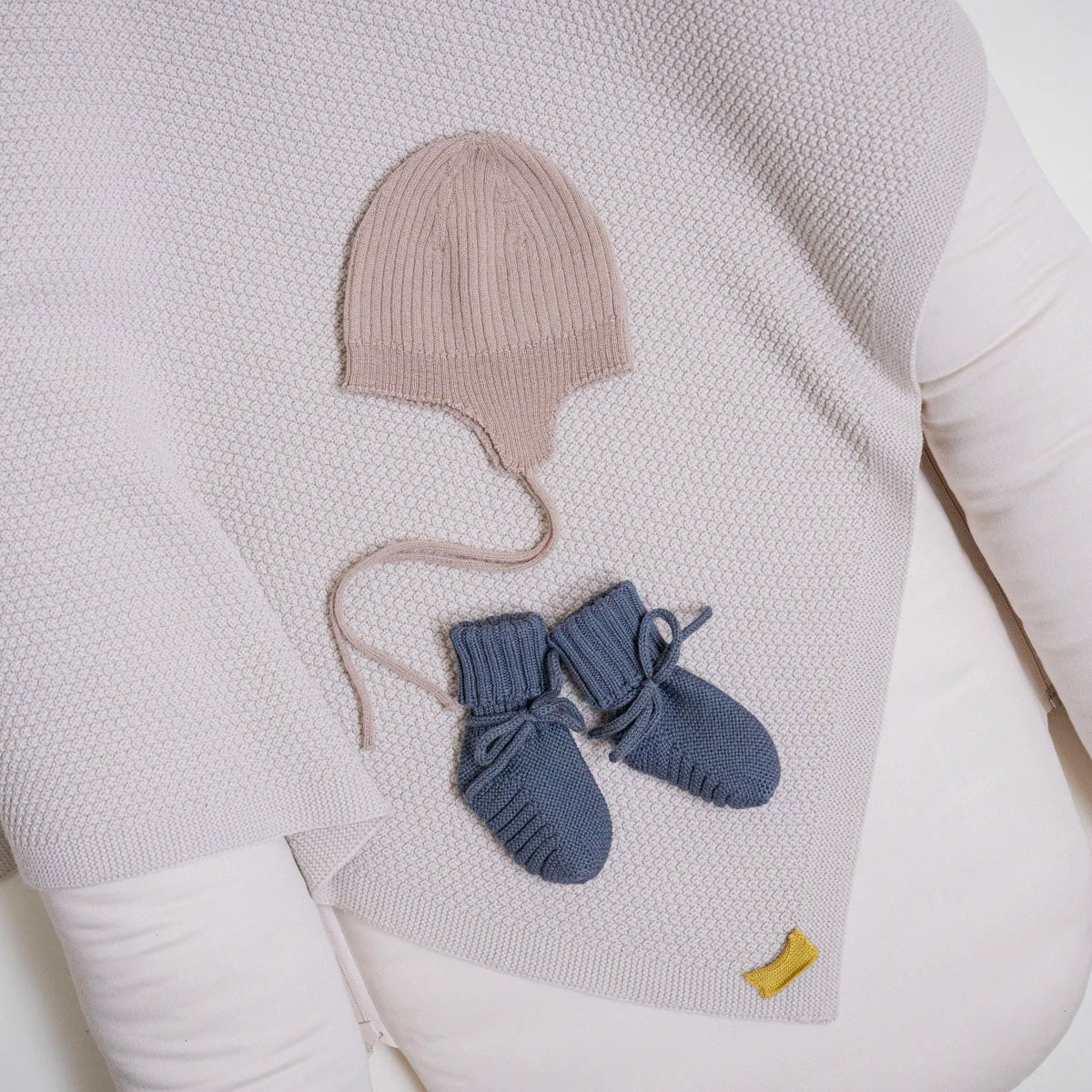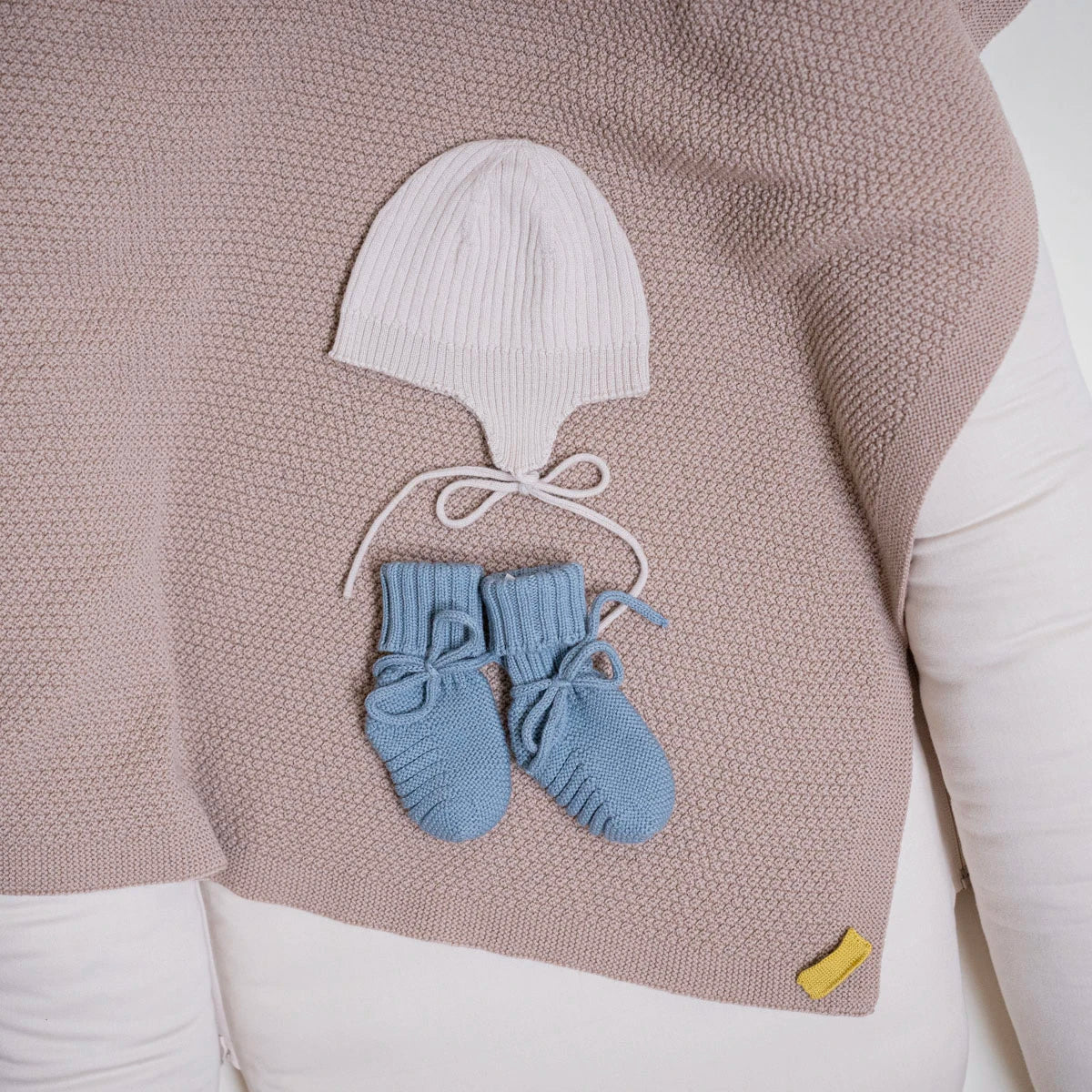Die weichste Babydecke für die schönsten Kuschelmomente in den kleinen Jahren und eine mitwachsende Baby-Mütze und Baby-Schuhe in einem Set.