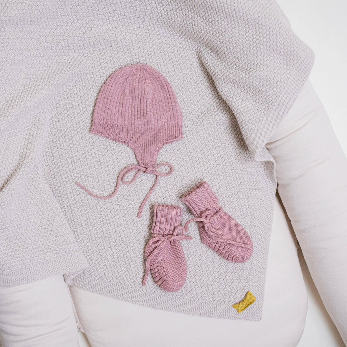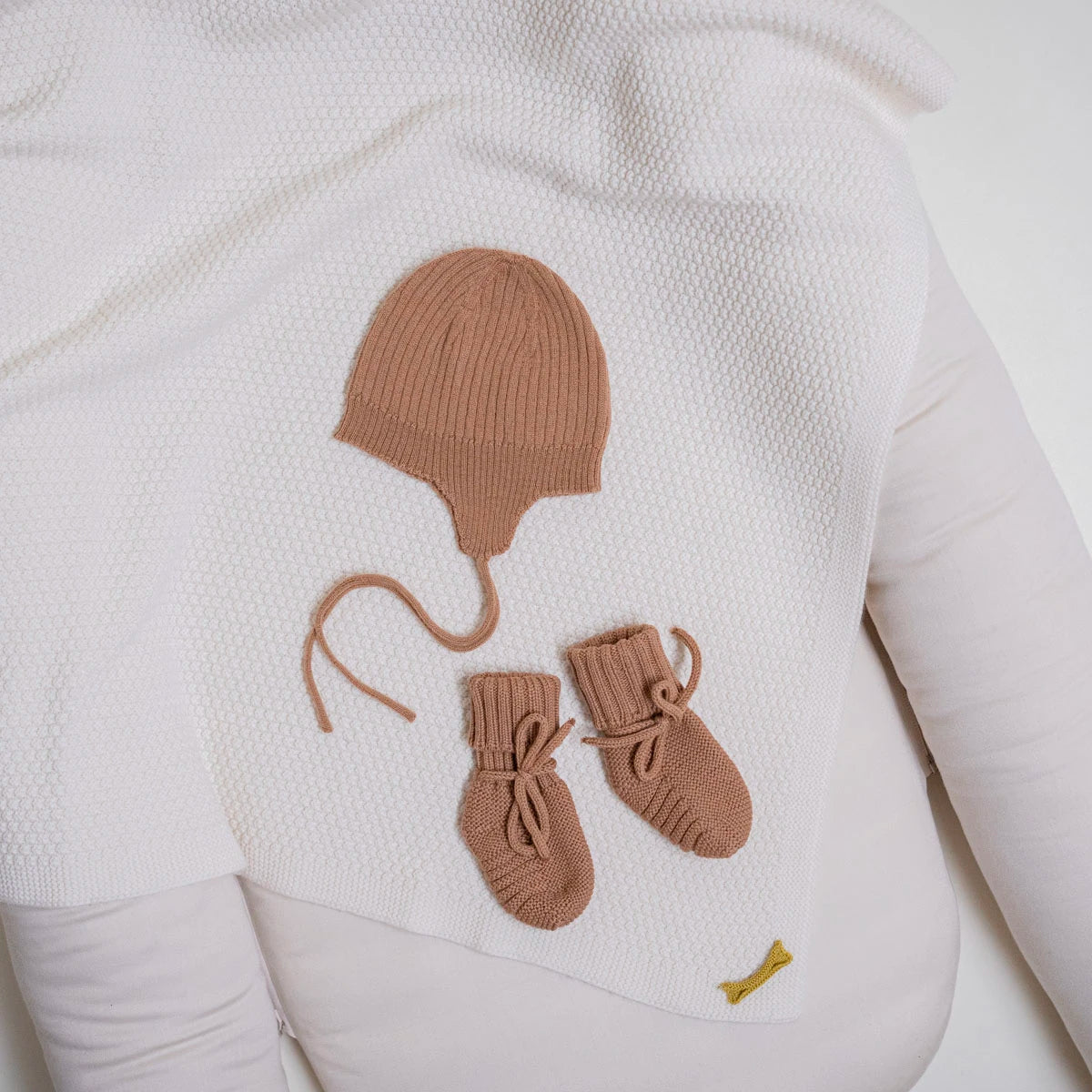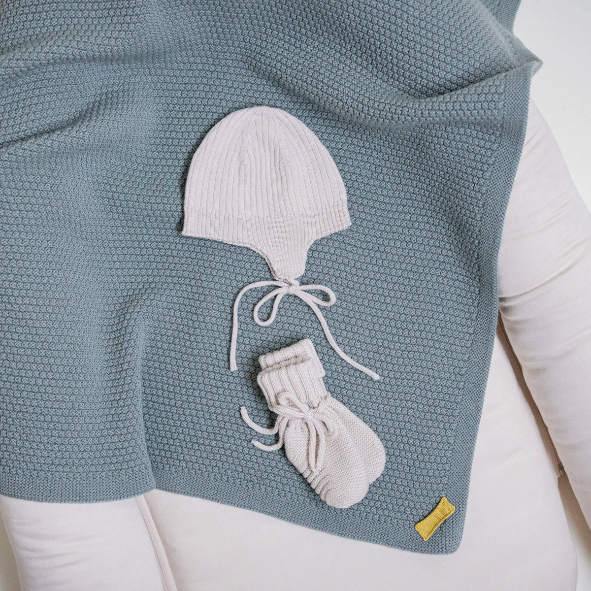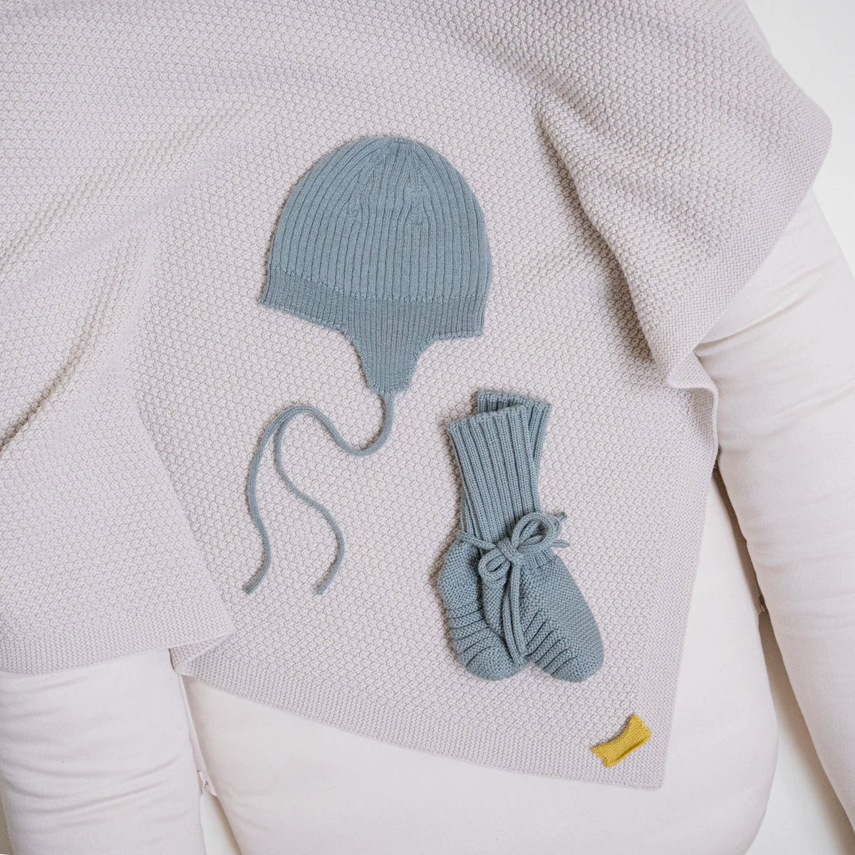 Die weichste Babydecke für die schönsten Kuschelmomente in den kleinen Jahren und eine mitwachsende Baby-Mütze und Baby-Schuhe in einem Set.