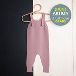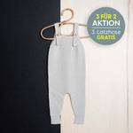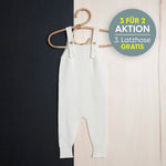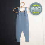 Lange Nutzungszeit: Dank der Doppelgrößen, des elastischen, weichen Stricks und einem raffinierten Schnitt wachsen Latzhose und Mütze über mindestens 2-3 Größen mit.