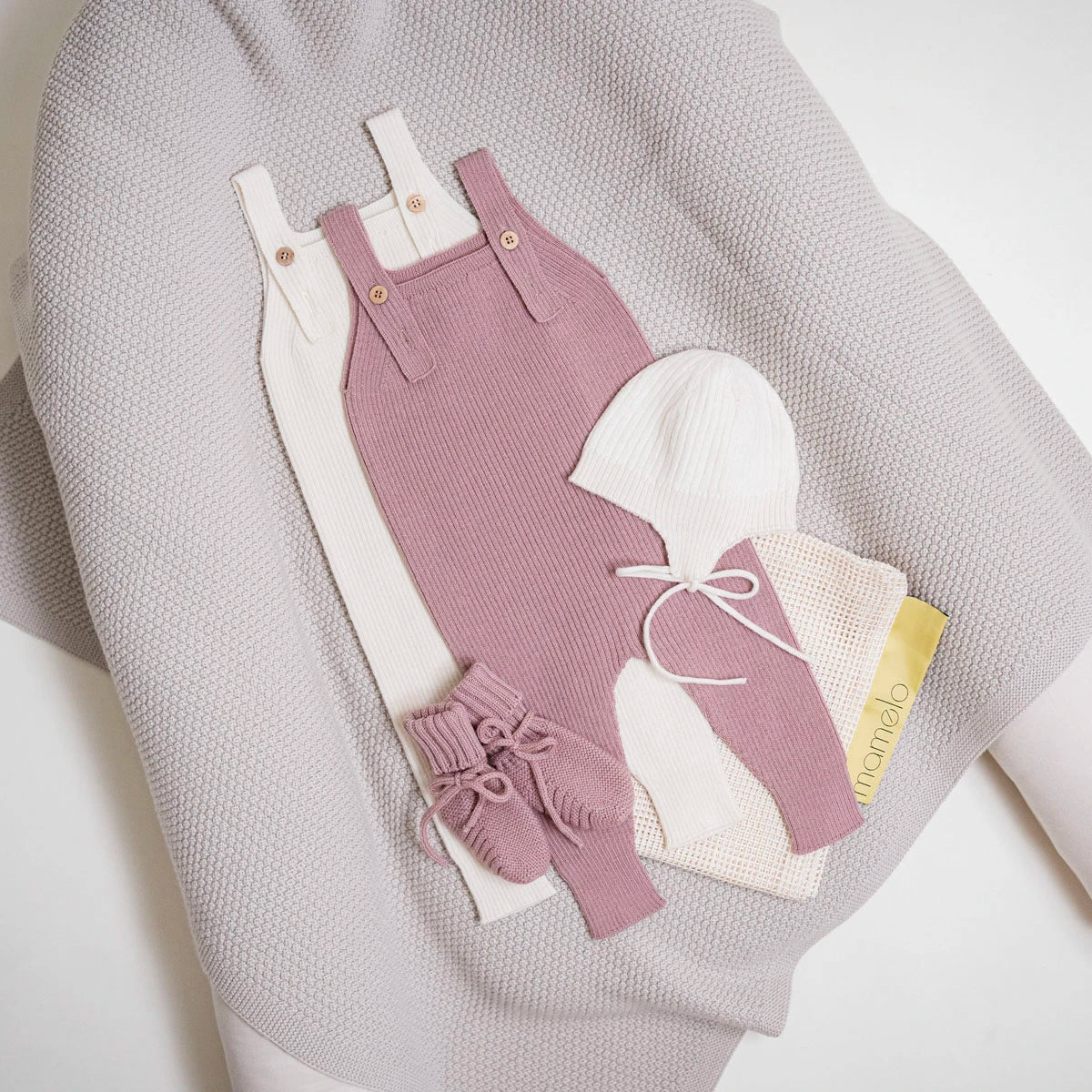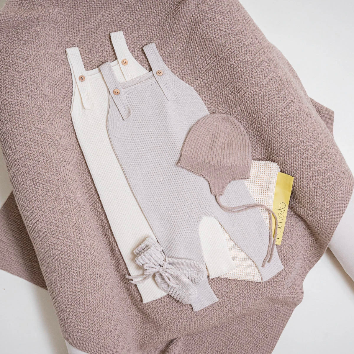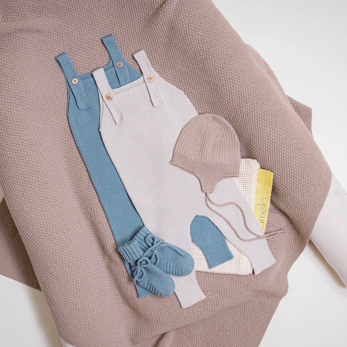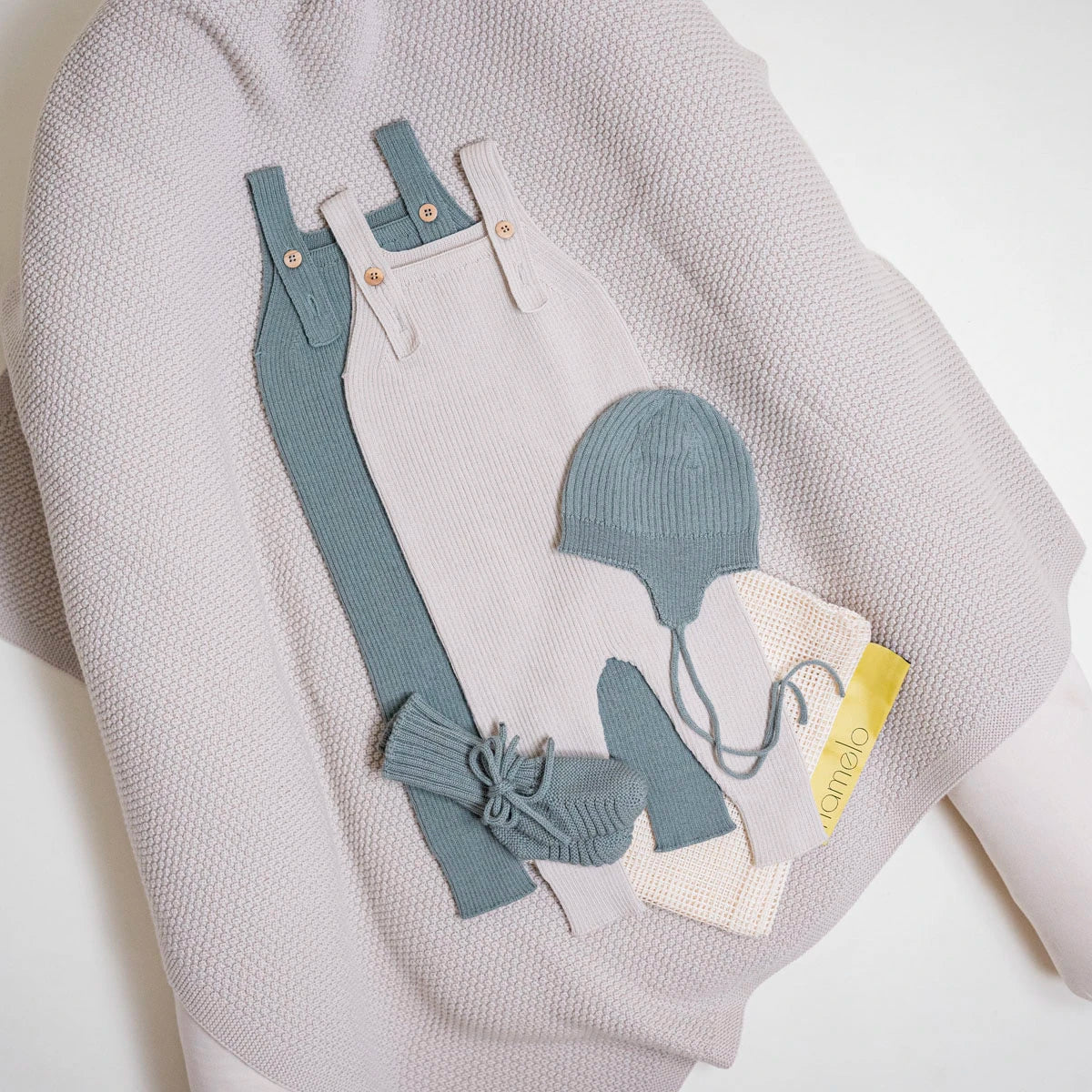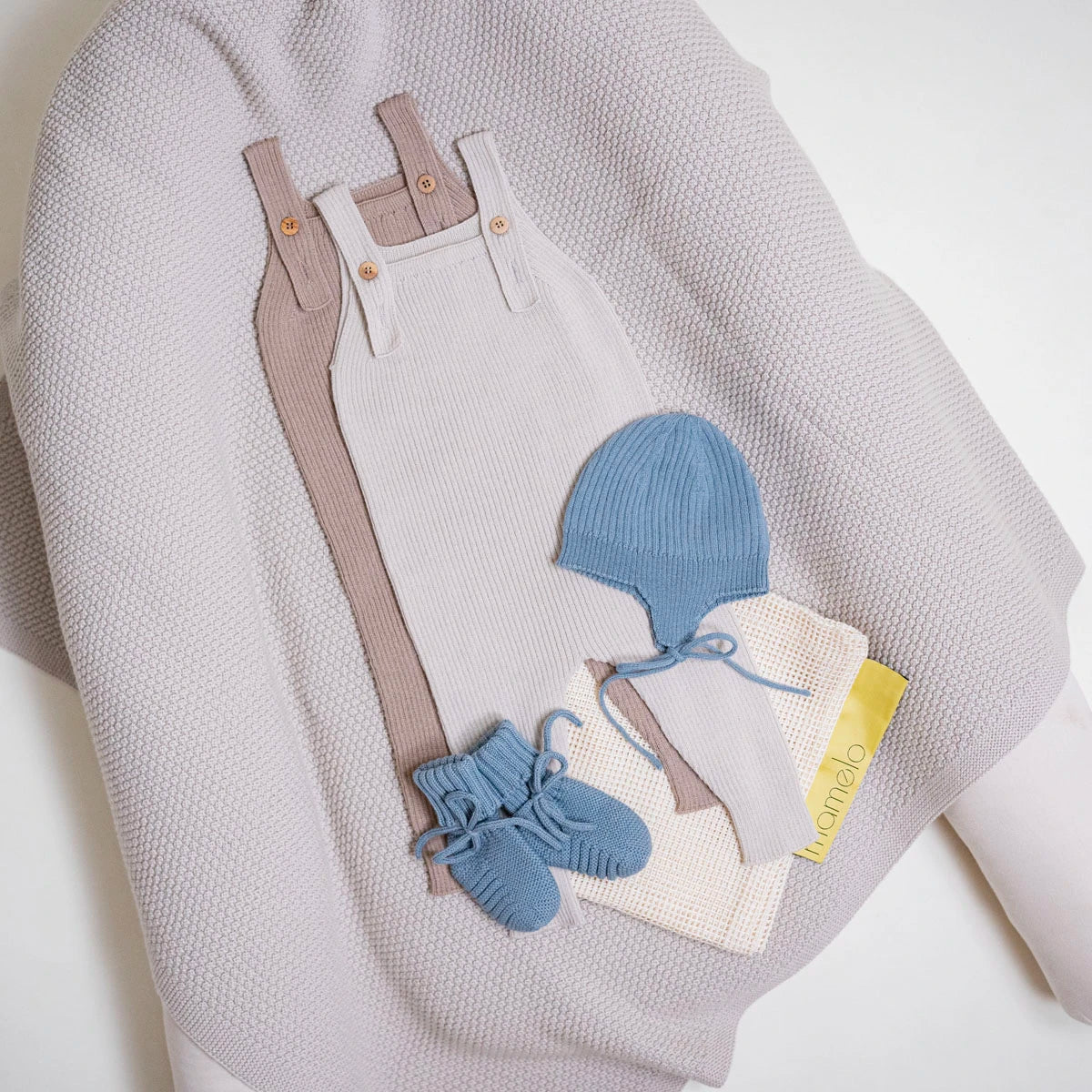 Die weichste Babydecke für die schönsten Kuschelmomente in den kleinen Jahren und eine mitwachsende Baby-Mütze und Baby-Schuhe in einem Set.