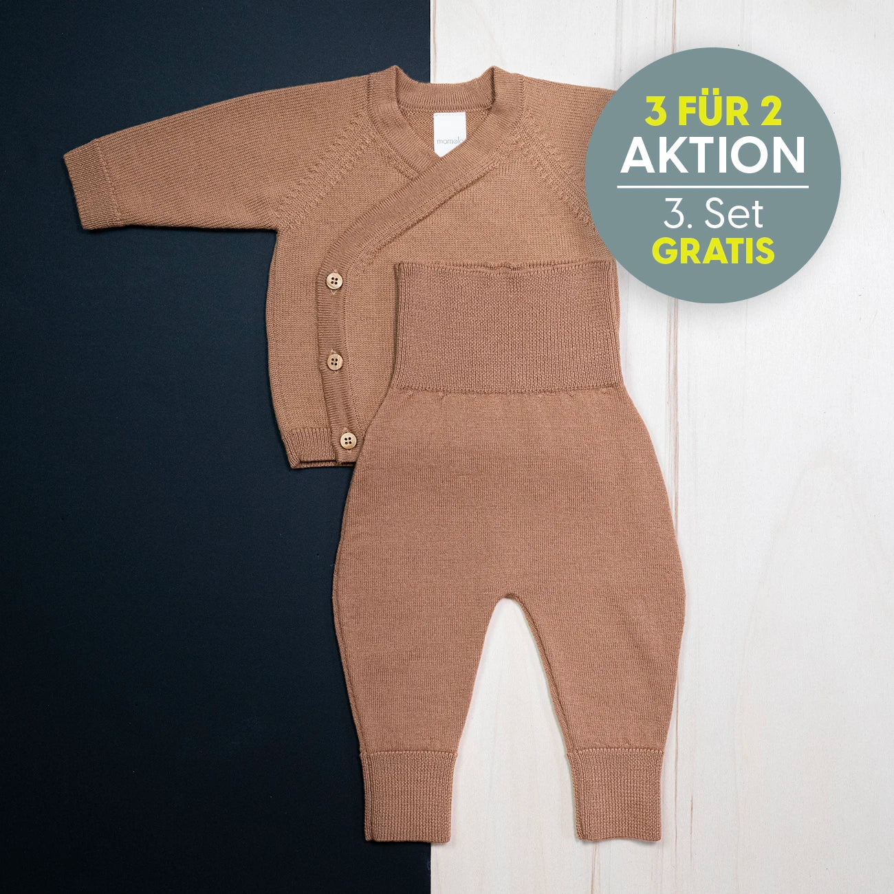 Lange Nutzungszeit: Dank des weichen, elastischen Stricks und des raffinierten Schnitts, wachsen Wickeljacke und Bundhose über mind. 3 Größen mit und können extra lange getragen werden.