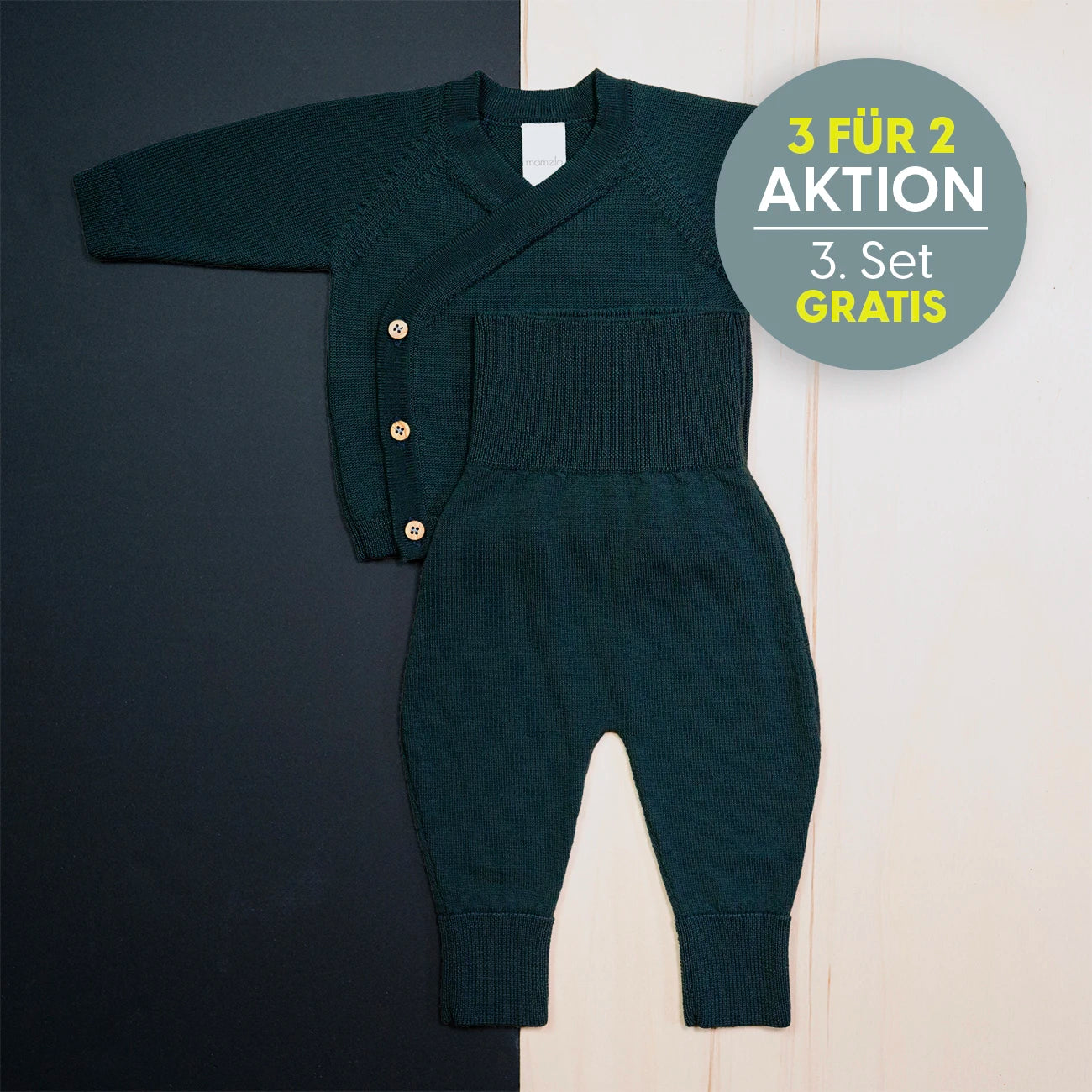 Kuschelige, mitwachsende Wickeljacke und Bundhose aus 100% mulesing-freier, GOTS Merinowolle. In unserem neuen Petrol: jetzt blaustichiger, weniger grün.