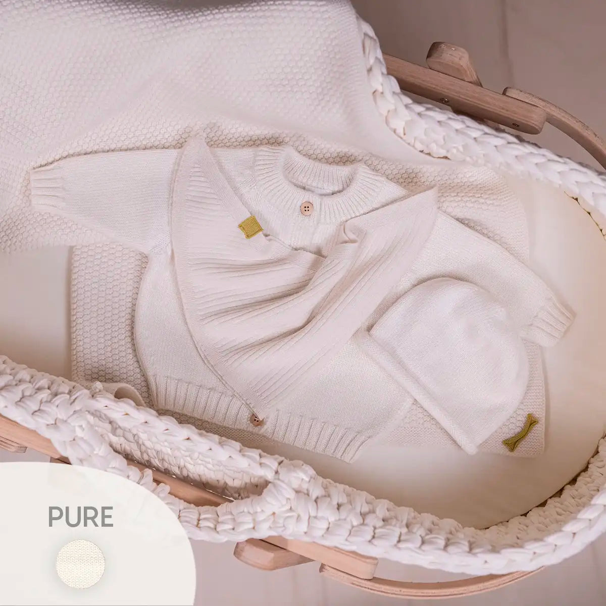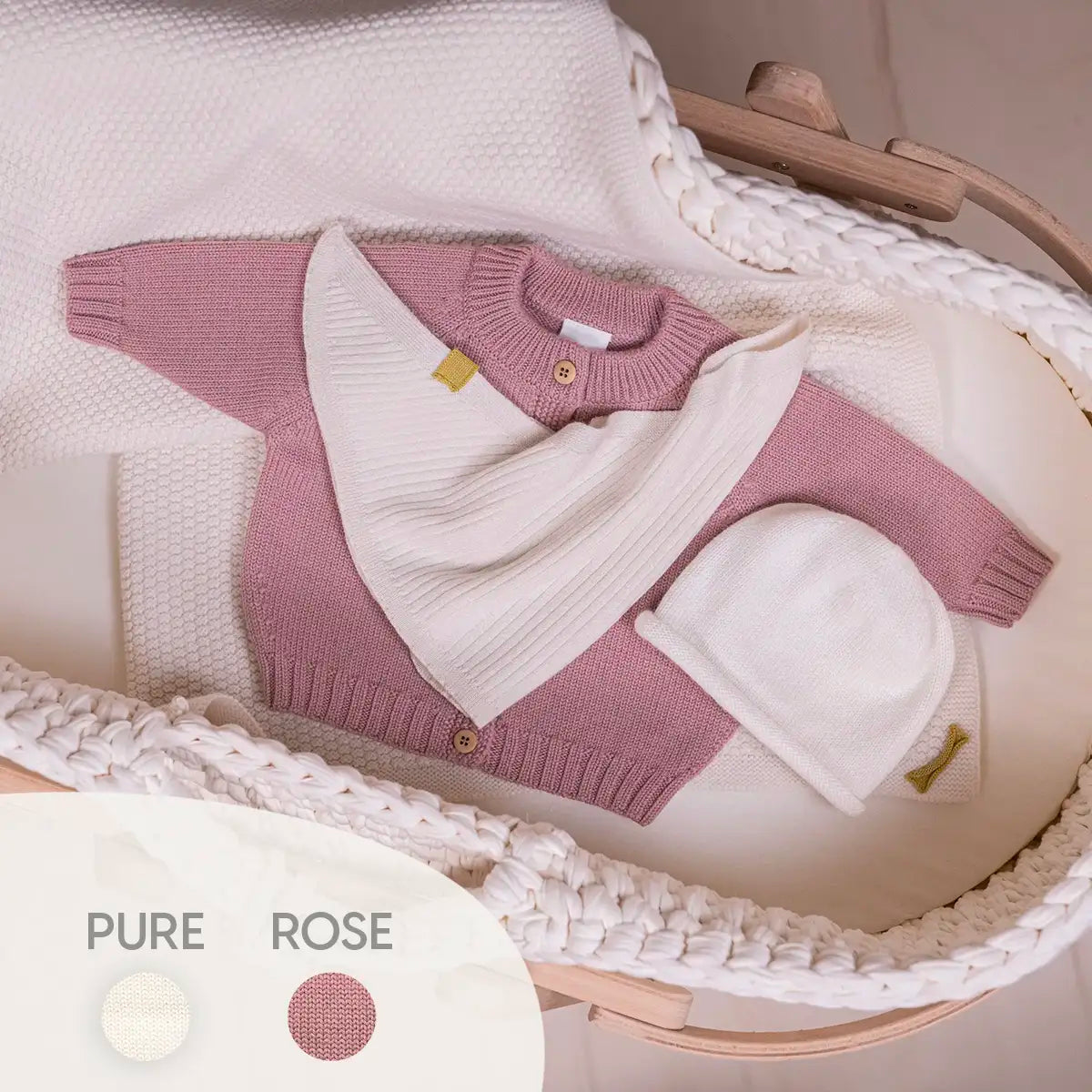 Unser "Premium Kuschel-Set Strickjacke" aus 100% super weicher, GOTS zertifizierter Merinowolle schenkt Neugeborenen und Babys Wärme und Geborgenheit von Geburt an und bringt alles Wichtige mit, damit sich die kleinen Mini-Menschen richtig geborgen fühlen und immer die schönste Wohlfühltemperatur haben: