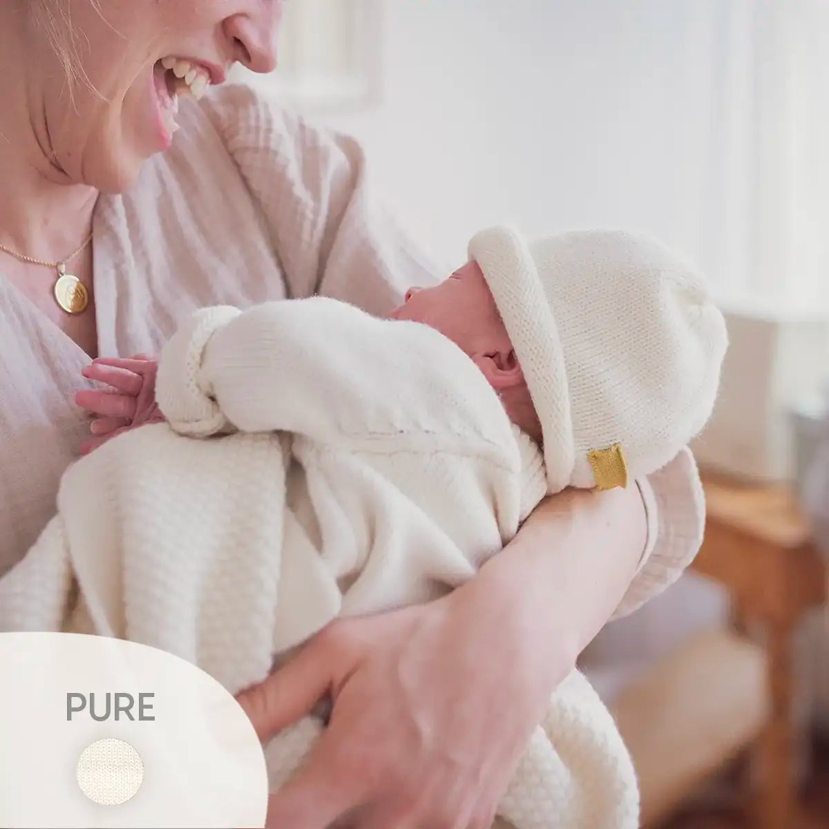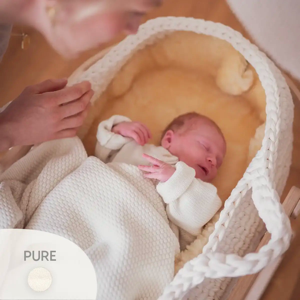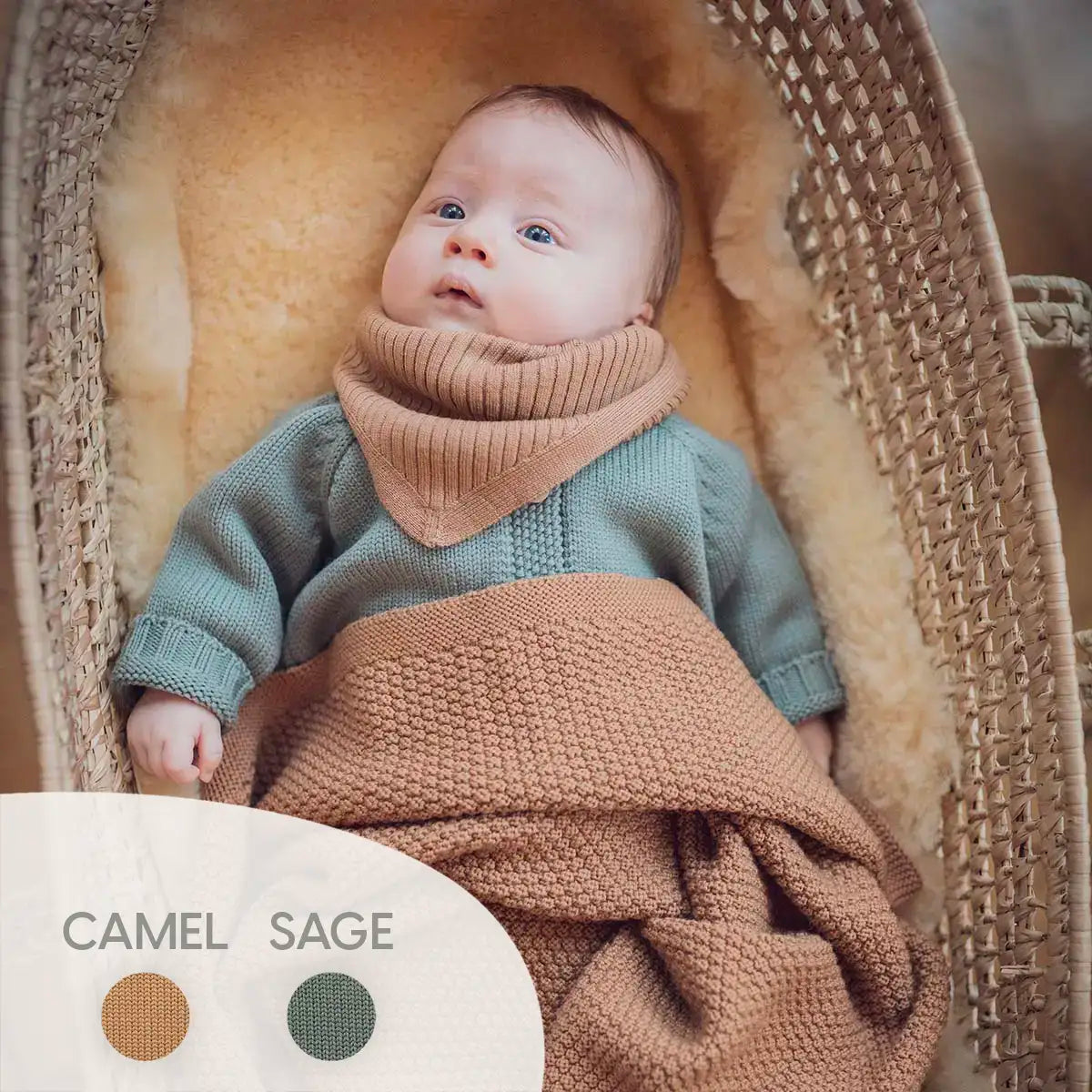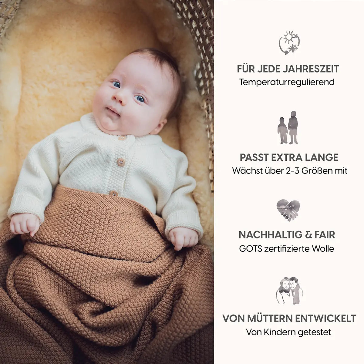 Wir haben uns für unsere Strickprodukte bewusst für Merinowolle entschieden. Denn keine andere Faser hat so viele natürliche Superkräfte, die deinem Kind den größtmöglichen Wohlfühlfaktor und dir das Vertrauen und die Sicherheit geben, die es für ein ruhiges und sanftes Ankommen und in den ersten Lebensmonaten braucht.