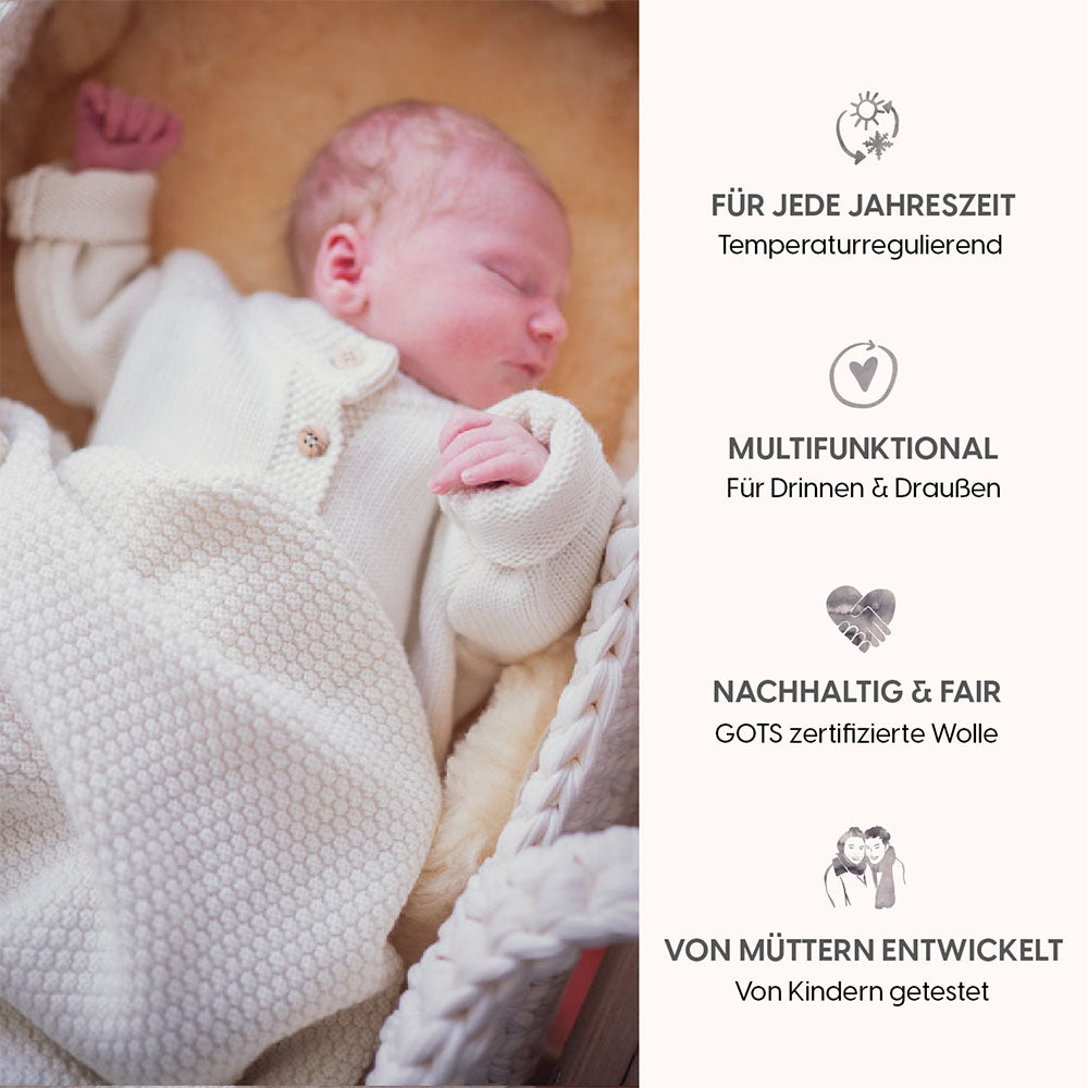 Unsere WOOLLY BLANKET ist ein wahres Multifunktions-Talent – ideal zum Kuscheln und Pucken, für den Kinderwagen und Autositz und als weiche, wärmende Unterlage auf dem Fußboden oder im Park.