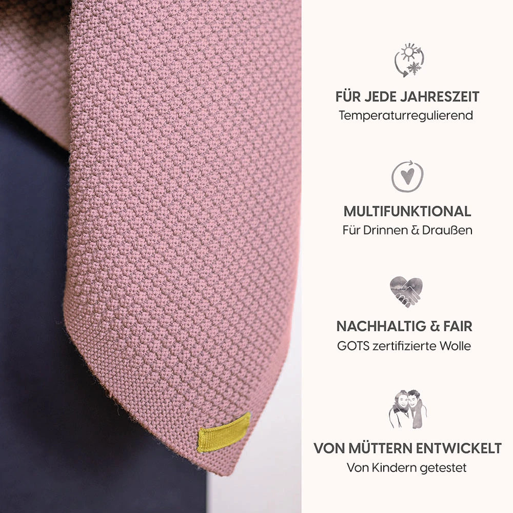 Unsere WOOLLY BLANKET ist ein wahres Multifunktions-Talent – ideal zum Kuscheln und Pucken, für den Kinderwagen und Autositz und als weiche, wärmende Unterlage auf dem Fußboden oder im Park.